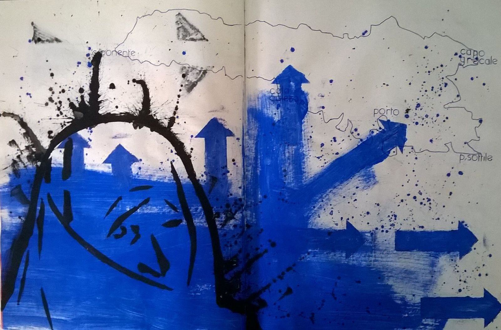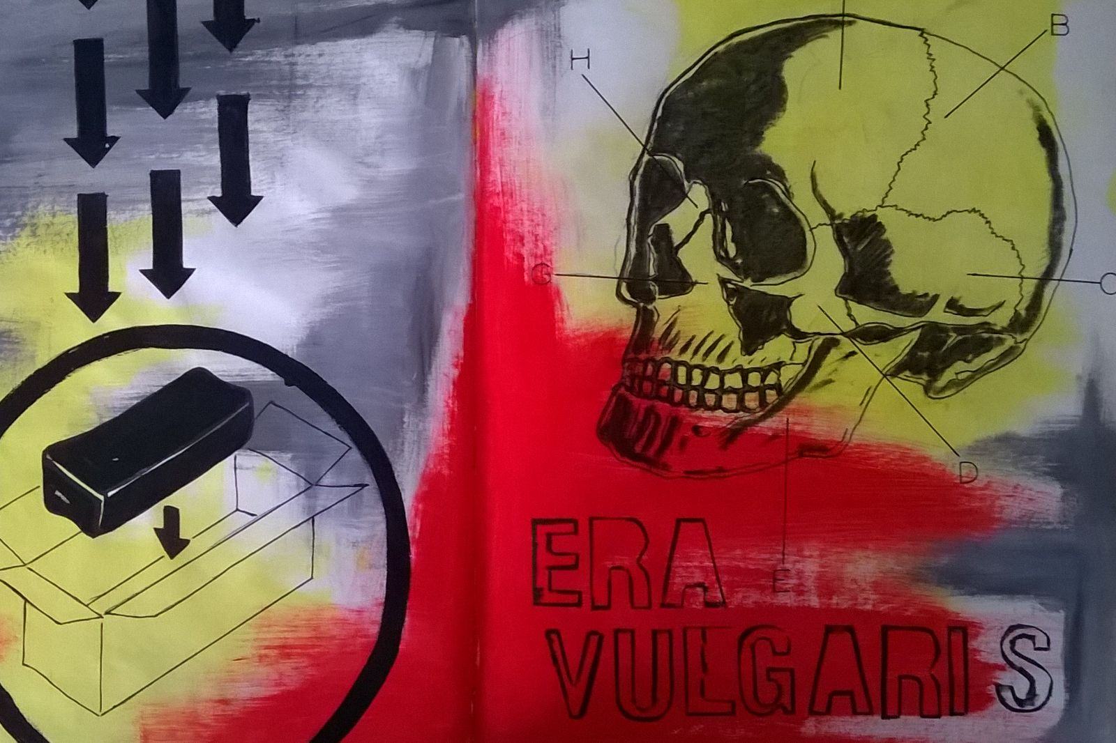In un sentito omaggio conclusivo alla città d’origine dell’artista e della curatrice, l’Era Vulgaris si affaccia sullo Stretto per una mini mostra-evento pensata appositamente per l’occasione. Una sorta di distaccamento o un piccolo ma emblematico sunto del percorso espositivo sviluppatosi presso il centro di ricerca lametino, racchiuso in un’unica opera-oggetto in forma di libro d’artista. Un compendio pittorico, work in progress, sulle cui pagine sono rappresentate le parole e le figure chiave, i dettagli, le sagome e le icone, le ispirazioni o le tematiche fondamentali appartenenti al ciclo Era Vulgaris, con le medesime cromie pure e sgargianti – in acrilico, pennarello e penna bic – stese con la consueta foga espressionistica. Al pari di miniature, dipinte su semplice carta riciclata, dei grandi lavori su tela. Praticamente tutta la mostra racchiusa in un libro. Itinerante, conducibile ovunque.