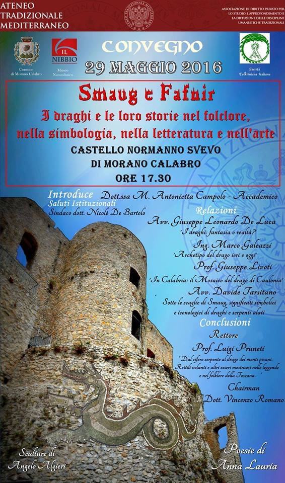 Trasferta cosentina per Le Muse ed il suo presidente Giuseppe Livoti che, in qualità di relatore è stato invitato domenica prossima, 29 maggio alle ore 17,30 in occasione del convegno presso il Castello Normanno Svevo di Morano Calabro, dal titolo “Smaug e Fafnir: i draghi e le loro storie nel folklore, nella simbologia, nella letteratura e nell’arte” organizzato con il patrocinio dell’amministrazione di Morano e del Museo Naturalistico “Il Nibbio”.
