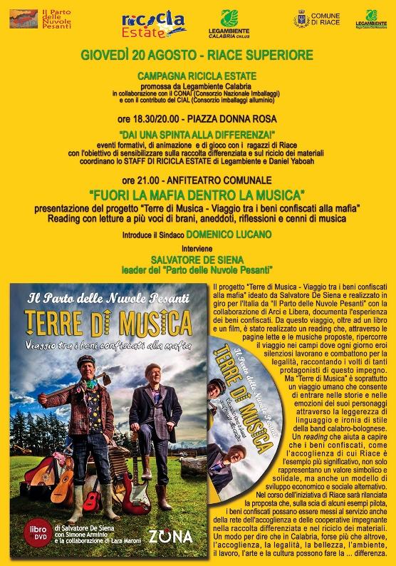 Si terrà GIOVEDÌ 20 AGOSTO 2015 a Riace Superiore, dopo l’annullamento della settimana scorsa a causa dell’allerta meteo, l’iniziativa “FUORI LA MAFIA DENTRO LA MUSICA”. Alle ore 21.00 nell’ANFITEATRO COMUNALE il Reading “Terre di Musica – Viaggio tra i beni confiscati alla mafia”, con letture di brani, aneddoti, riflessioni e cenni di musica di SALVATORE DE SIENA, leader de Il Parto delle Nuvole Pesanti, sarà introdotto da Domenico Lucano, Sindaco del Comune di Riace, e da Nuccio Barillà, della Segreteria Nazionale di Legambiente.
