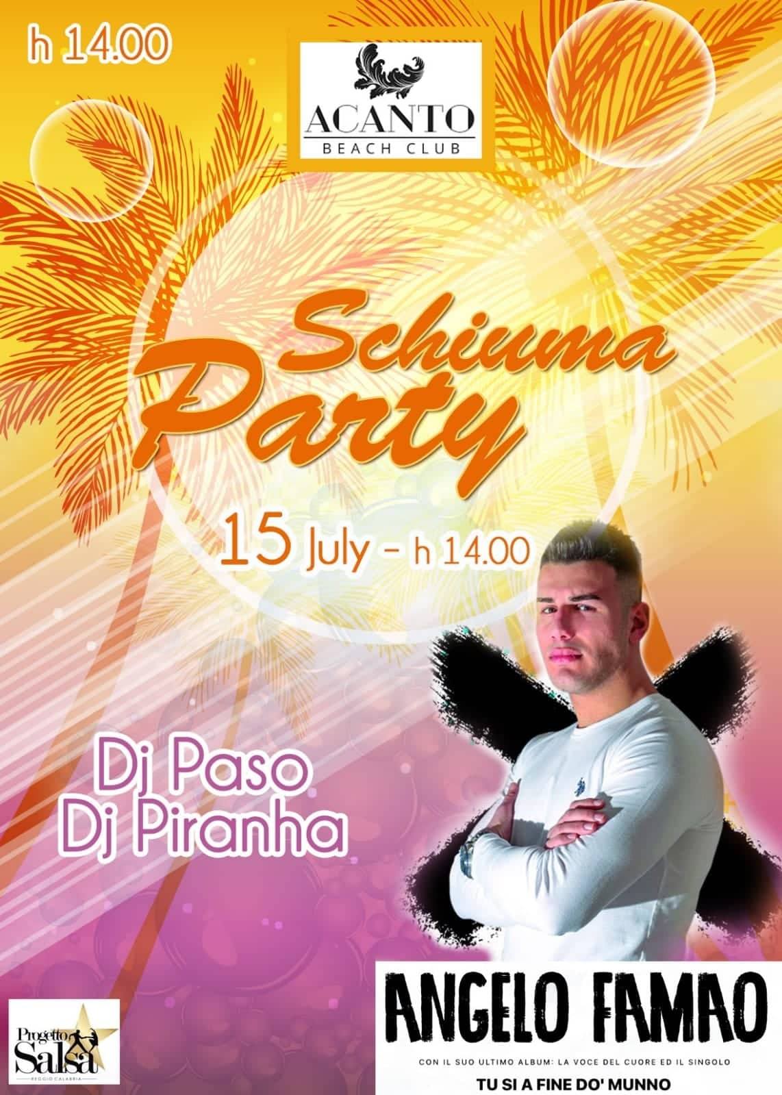 Schiuma party speciale all’Acanto Beach Club. Domenica 15 luglio presso lo stabilimento balneare situato a Melito Porto Salvo ospite Angelo Famao per un evento da non perdere. Artista seguitissimo sui social e su You Tube (la canzone ‘Tu Si a Fine do’ Munno’ è arrivata a ben 10 milioni di visualizzazioni, dato impressionante), Famao dopo diverse date tra Calabria e Sicilia sarà il prossimo ospite di Acanto Beach Club.