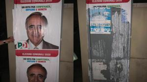 Manifesti elettorali anche nei luoghi più impensabili. Per fortuna, qualcuno sta provvedendo alla pulizia