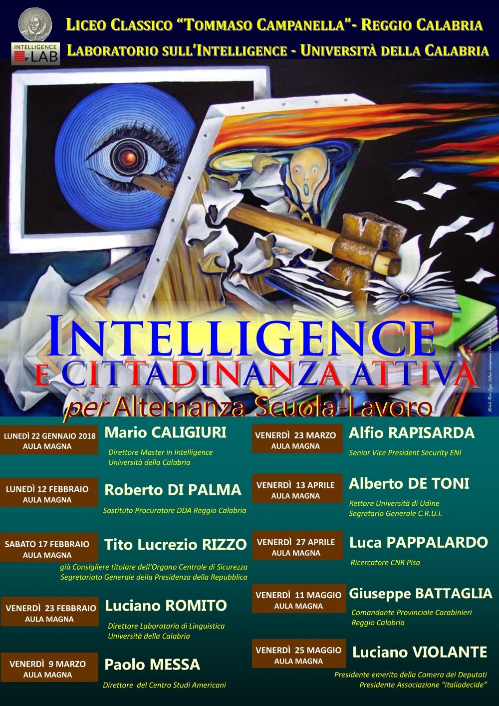 Il corso, che si svolgerà da gennaio a maggio, prevede la partecipazione di illustri relatori che incontreranno gli studenti delle quarte classi, sezioni B e D, del Campanella: da Mario Caligiuri, tra i primi a introdurre lo studio scientifico dell’intelligence negli atenei italiani, a Roberto Di Palma (Sostituto Procuratore DDA di Reggio Calabria), da Tito Lucrezio Rizzo (già Consigliere titolare dell’Organo centrale di Sicurezza della Presidenza della Repubblica) a Luciano Romito (Direttore del Laboratorio di Linguistica – UniCal), da Paolo Messa (Direttore del Centro Studi Americani) ad Alfio Rapisarda (Security Vice President ENI), da Alberto De Toni (Rettore dell’Università degli Studi di Udine e Segretario Generale presso la Conferenza dei Rettori delle Università Italiane) a Luca Pappalardo (esperto in Big Data Analysis – CNR Pisa), da Giuseppe Battaglia (Comandante Provinciale dei Carabinieri di Reggio Calabria) a Luciano Violante (già Presidente della Camera dei Deputati e attualmente Presidente di “italiadecide”, associazione per la qualità delle politiche pubbliche).