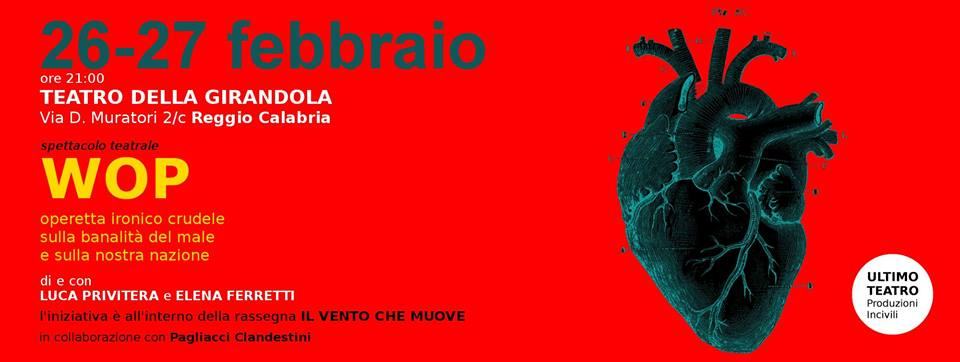 Il Teatro della Girandola promuove venerdì 26 febbraio e in replica sabato 27 febbraio ore 21:00 lo spettacolo dal titolo “WOP – operetta ironico crudele sulla banalità del male e sulla nostra nazione” lo spettacolo più razzista e discriminatorio di sempre! Ci sarà da ridere! Lo spettacolo rientra nella rassegna “Il vento che muove”.