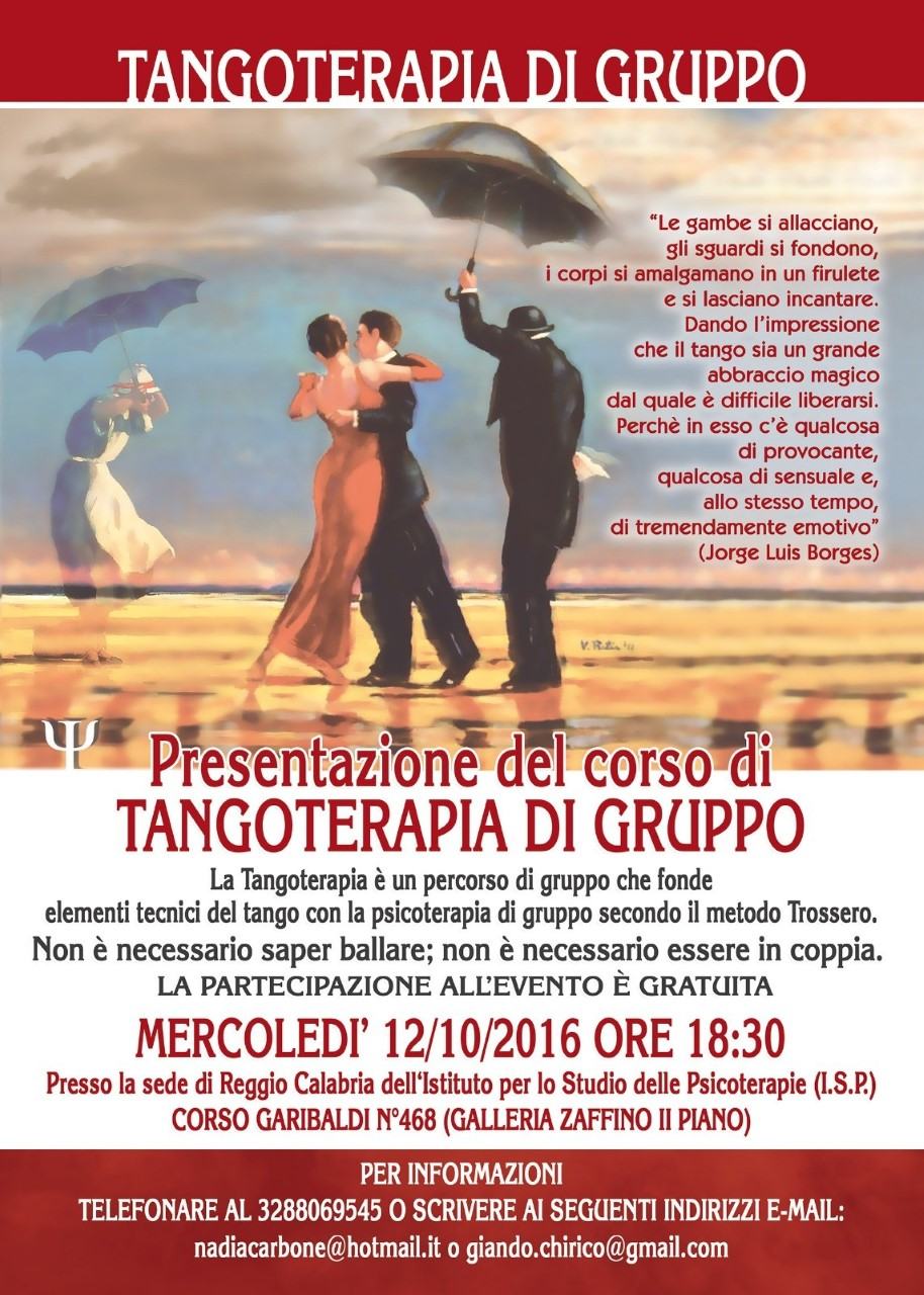 Il 12/10/2016 alle ore 18:30, avverrà, tramite conferenza stampa, la presentazione del percorso di Tangoterapia di gruppo. La Tangoterapia è un percorso di gruppo che fonde gli elementi tecnici del tango con la psicoterapia di gruppo secondo il metodo Trossero. Tale percorso verrà presentato dal Dott. Giandomenico Chirico, dalla Dott.ssa Nadia Carbone, da Umberto Anoldo e dalla Dott.ssa Concetta Condello presso la sede dell’Istituto per lo studio delle Psicoterapie di Reggio Calabria sita in Corso Garibaldi n° 468 (Galleria Zaffino II Piano).