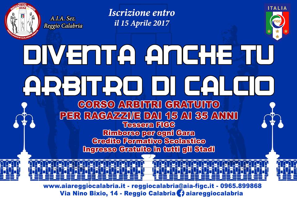 L’Associazione Italiana Arbitri sezione di Reggio Calabria comunica che sono aperte le iscrizioni al corso per arbitri di calcio per i raggazzi/e dai 15 ai 35 anni di età.