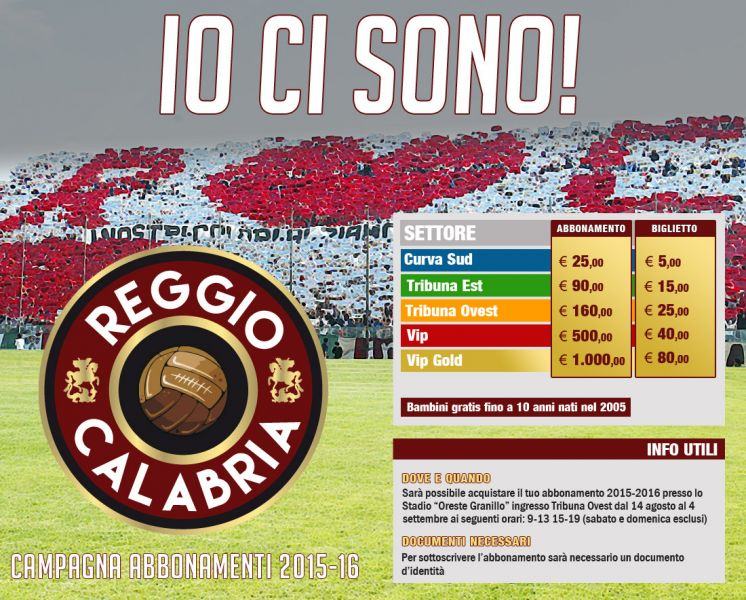 Sarà possibile acquistare l’abbonamento 2015-2016 presso lo Stadio “Oreste Granillo” ingresso Tribuna Ovest dal 14 agosto al 4 settembre ai seguenti orari: 9-13 15-19 (sabato e domenica esclusi).
