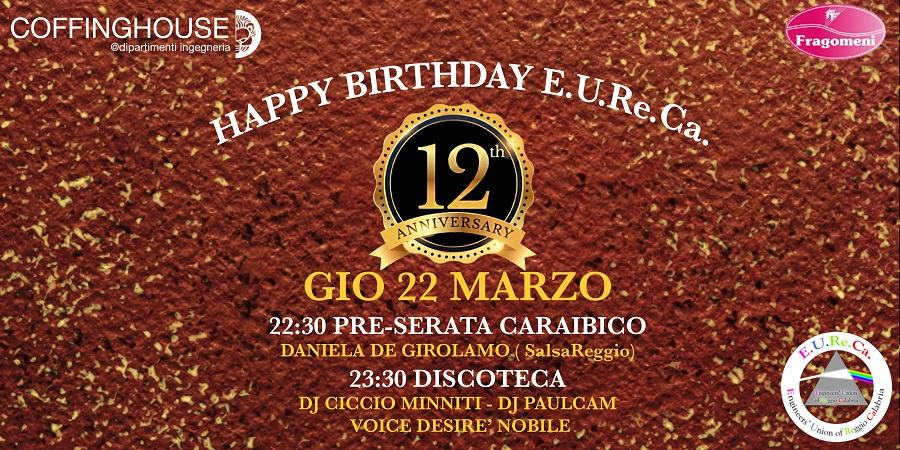 Per festeggiare i suoi 12 anni di attività, l’Associazione Studentesca Culturale “E.U.Re.Ca.” organizza un evento, programmato per Giovedì 22 Marzo (ore 22.30) presso il CoffingHouse (Caffetteria dei Dipartimenti di Ingegneria). Si tratterà di una serata all’insegna della musica e del ballo, con la quale l’Associazione intende celebrare l’importante traguardo raggiunto insieme a coloro i quali vorranno condividerlo.