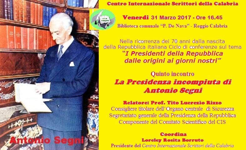 Nella ricorrenza dei settanta anni dalla nascita della Repubblica italiana, il Centro Internazionale Scrittori della Calabria promuove un ciclo di conferenze sul tema “I Presidenti della Repubblica dalle origini ai giorni nostri”. Venerdì 31 marzo c. m., alle ore 16.45, presso la Biblioteca comunale “P. De Nava” di Reggio Calabria si svolgerà il quinto incontro “La Presidenza incompiuta di Antonio Segni”.