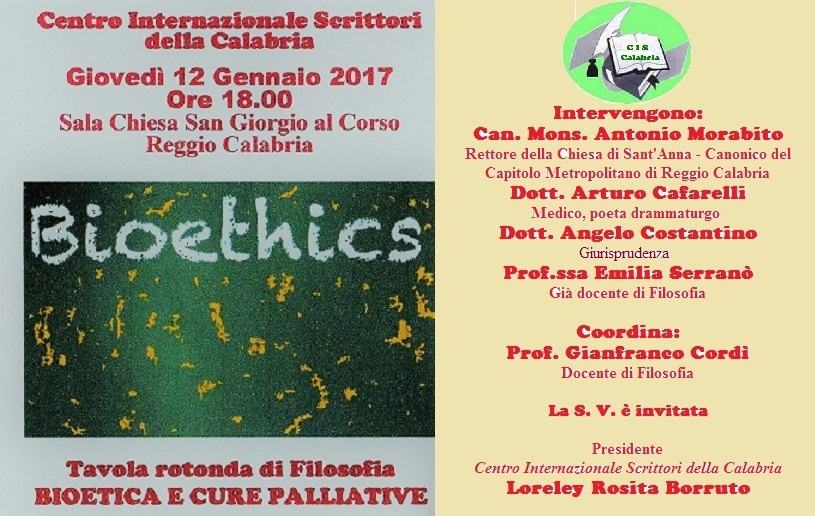 Giovedì 12 gennaio 2017, alle ore 18,00, nella sala della chiesa di San Giorgio al Corso – Reggio Calabria, il Centro Internazionale Scrittori promuove la tavola rotonda di filosofia “Bioetica e cure palliative”.