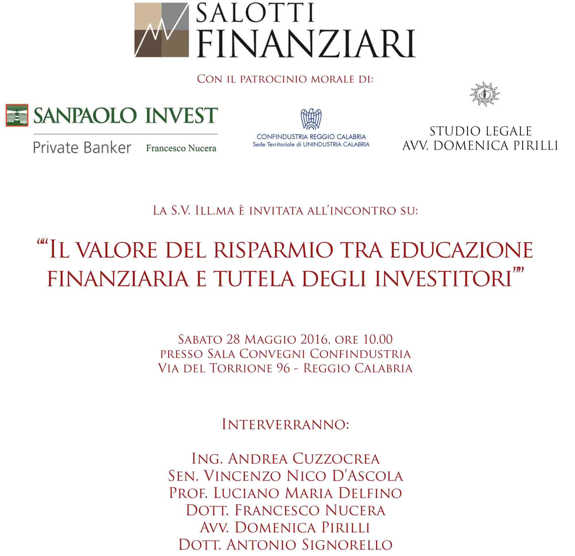 Ai lavori coordinati e moderati da Francesco Nucera, group manager di Sanpaolo Invest, prenderanno parte alcuni autorevoli personalità delle professioni, dell’accademia e della politica della nostra città, con l’obiettivo di chiarire quale è lo “stato dell’arte” in materia di crisi bancarie, tutela dei risparmiatori e strumenti normativi finalizzati a canalizzare il risparmio dei privati verso le imprese ed il tessuto economico del Paese.
