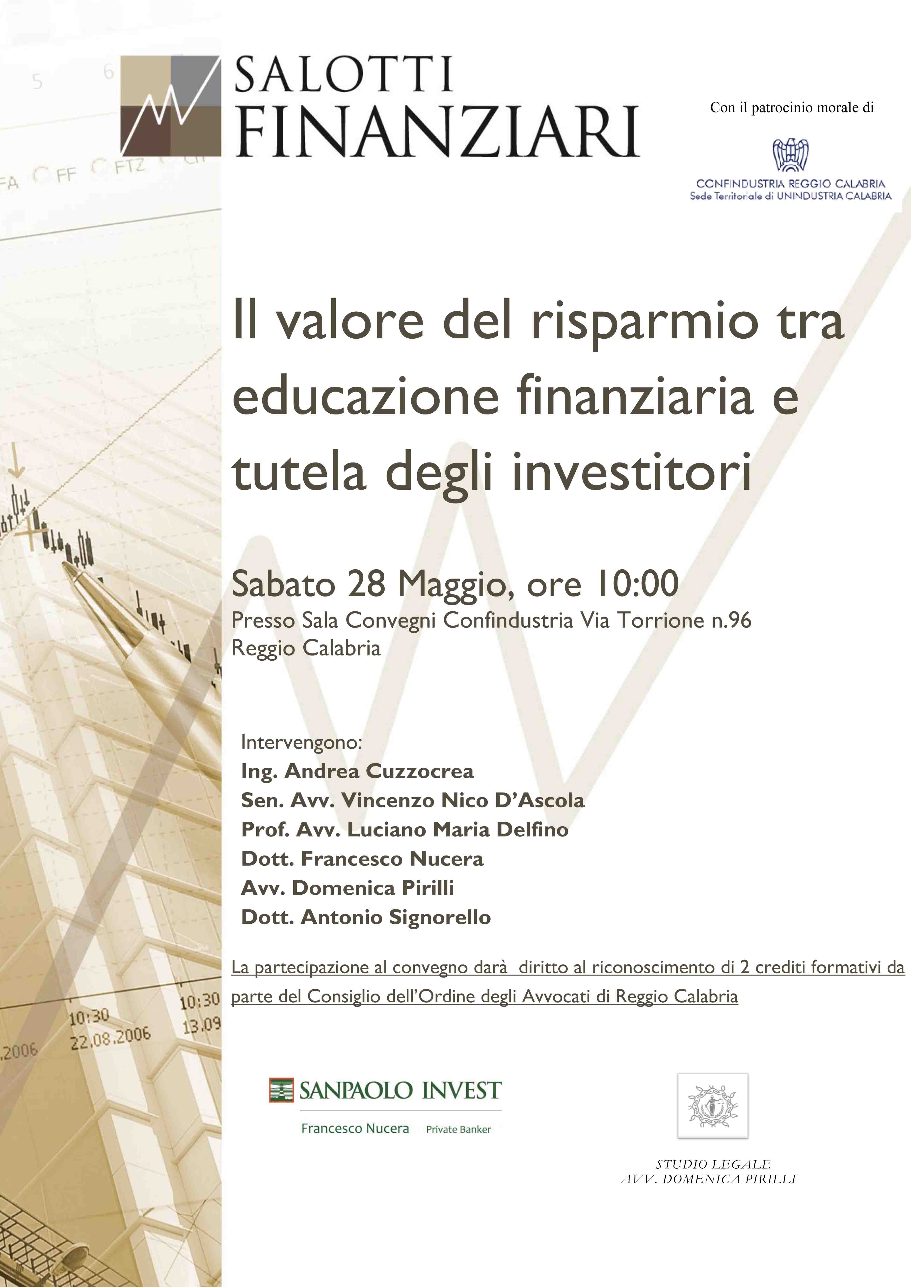 Domani, nella sede di Confindustria a Reggio Calabria a partire dalle ore 10.30, si terrà una nuova sessione dei Salotti finanziari dal titolo: il Valore del risparmio tra educazione finanziaria e tutela degli investitori.