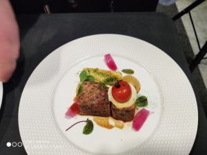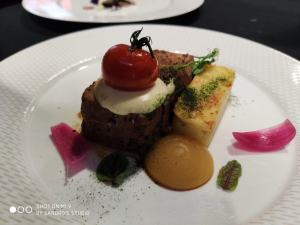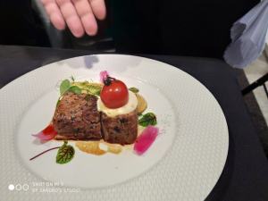 La main course “portata principale” ideata dallo chef Isabella e testato insieme al suo team, composto dal coach Salvatore D’Alterio, al second chef Alessandro Biviano e allo junior chef Shreee Ram, è un filetto di maialino nero di Calabria cotto nel fieno d’avena, servito con una purea di mele, salsa al basilico, cipolla rossa di Tropea caramellata e mousse di parmigiano Reggiano al profumo di liquirizia di Rossano Calabro.
