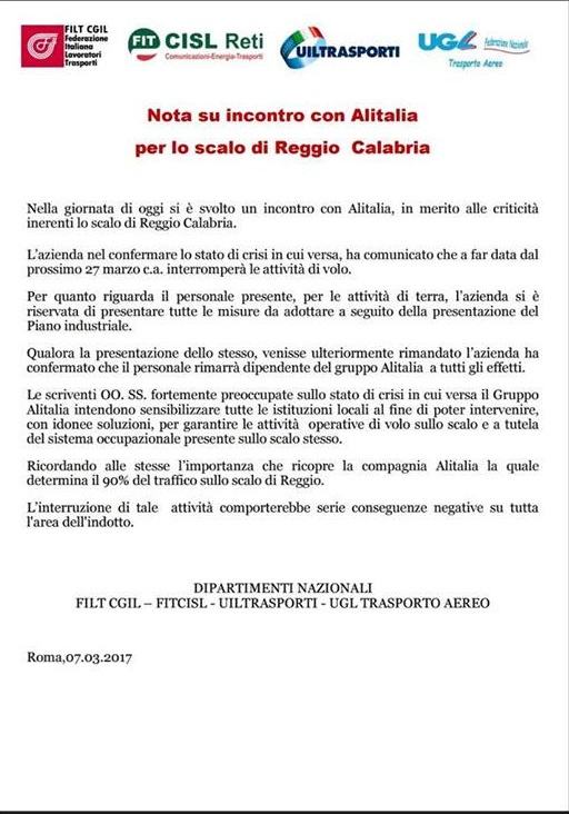“Mentre ENAC, proprio oggi, aggiudica alla società SACAL la gara per la gestione degli aeroporti di Reggio Calabria e Crotone, poche ore fa, il management di Alitalia, nel corso di un incontro nazionale, ha comunicato la decisione di cessare le proprie attività volative sullo scalo di Reggio Calabria in quanto, le stesse, registrano perdite di circa 8 milioni di euro che la società non può più sostenere”.