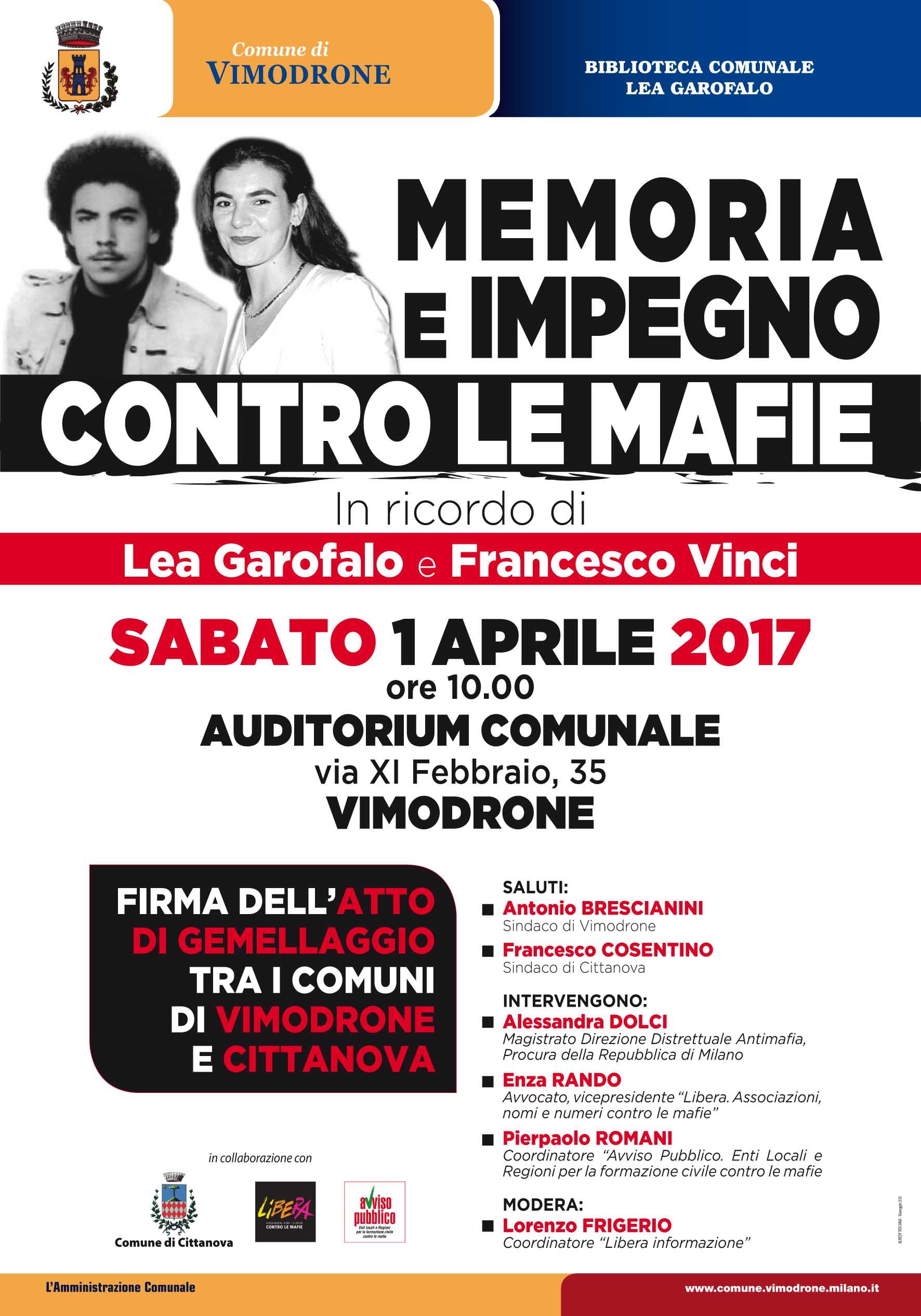 A loro due, alla loro memoria e alla memoria di tutte le vittime innocenti della ‘ndrangheta è dedicata la giornata “memoria e impegno contro le mafie” durante la quale sarà firmato l’atto di gemellaggio tra i comuni di Vimodrone e Cittanova. L’appuntamento è per sabato 1 aprile alle ore 10 nell’auditorium comunale della cittadina milanese, e prevede, dopo i saluti dei sindaci Antonio Brescianini e Francesco Cosentino, gli interventi di Alessandra Dolci, magistrato della Dda della Procura di Milano, di Enza Rando, vicepresidente di Libera e avvocato che accompagnò le scelte di Lea e, dopo il suo assassinio, le denunce della figlia Denise Cosco, e di Pierpaolo Romani, coordinatore nazionale di Avviso Pubblico. Modererà l’incontro Lorenzo Frigerio, coordinatore di “Libera Informazione”.