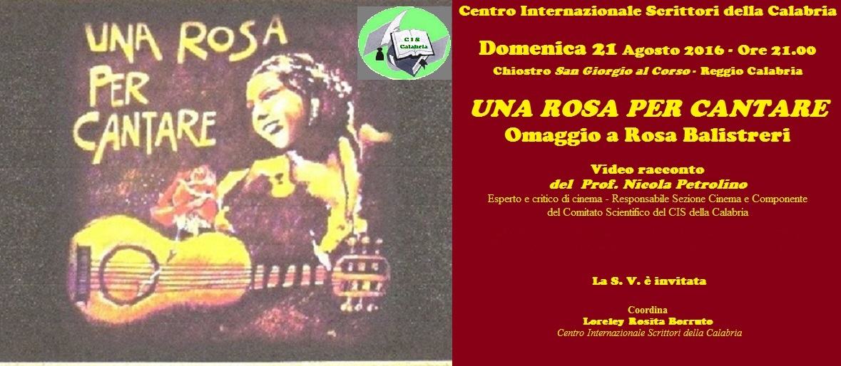 Domenica 21 Agosto 2016, alle ore 21.00, nello spazio del Chiostro della chiesa di S. Giorgio al Corso, il Centro Internazionale Scrittori promuove l’incontro “Una Rosa per cantare: omaggio a Rosa Balistreri. Rosa Balistreri, la cantatrice di Licata, è l’interprete che negli anni 70-90 ha raccontato con la sua voce la Sicilia, con una passione e una carica umana non comuni.