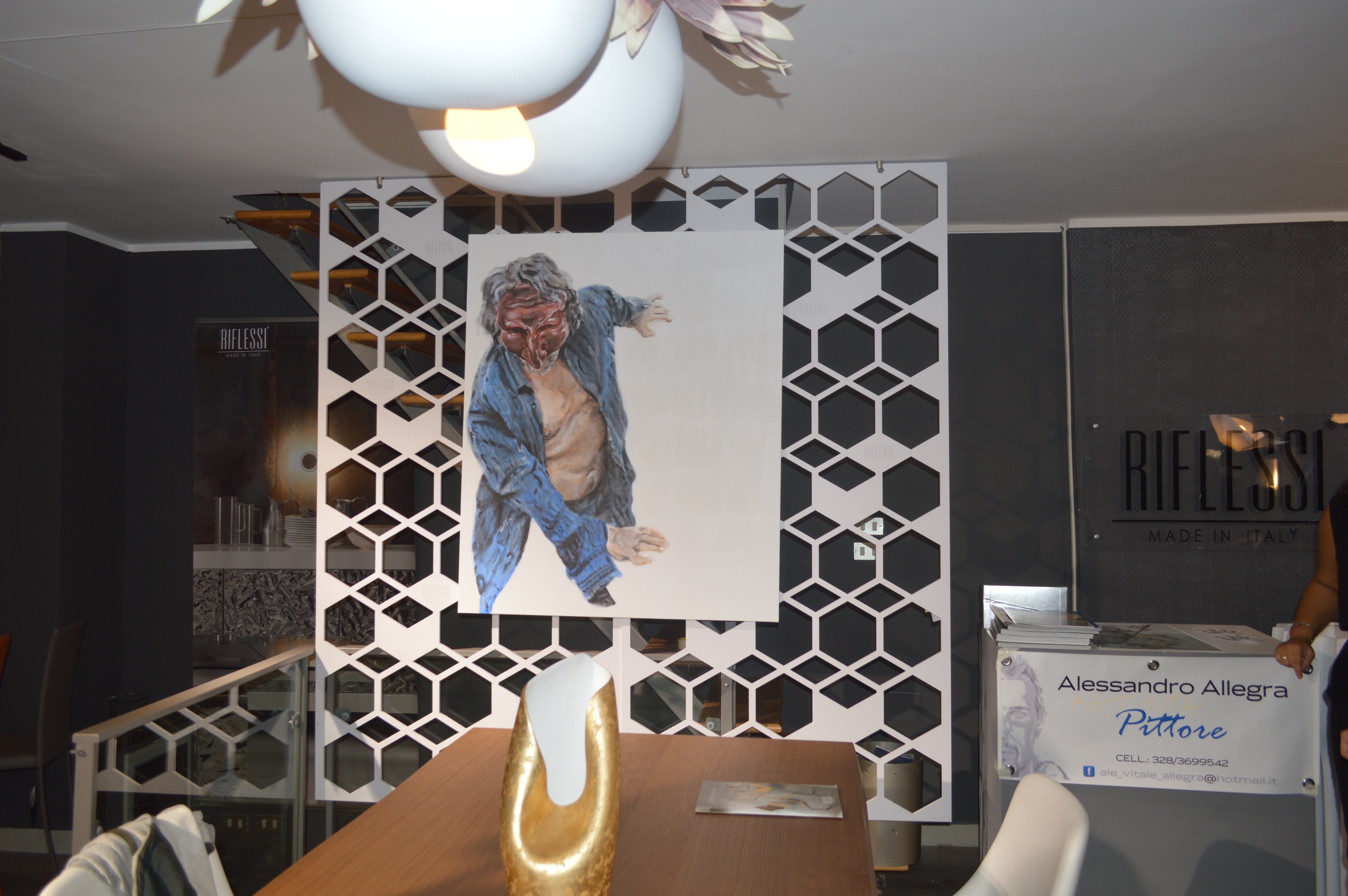 Durante l’inaugurazione Allegra ha presentato il suo ultimo lavoro, una tela di un metro per un metro e venti, che rappresenta un uomo con una maschera teatrale: <<La mia nuova opera, nasce vivendo una sfaccettatura del teatro che è quella della maschera teatrale, uno dei capi saldi del mondo del teatro. Pulcinella o tanti altri personaggi, non sono invenzioni o favole, sono proiezioni di stati d’animo>>.