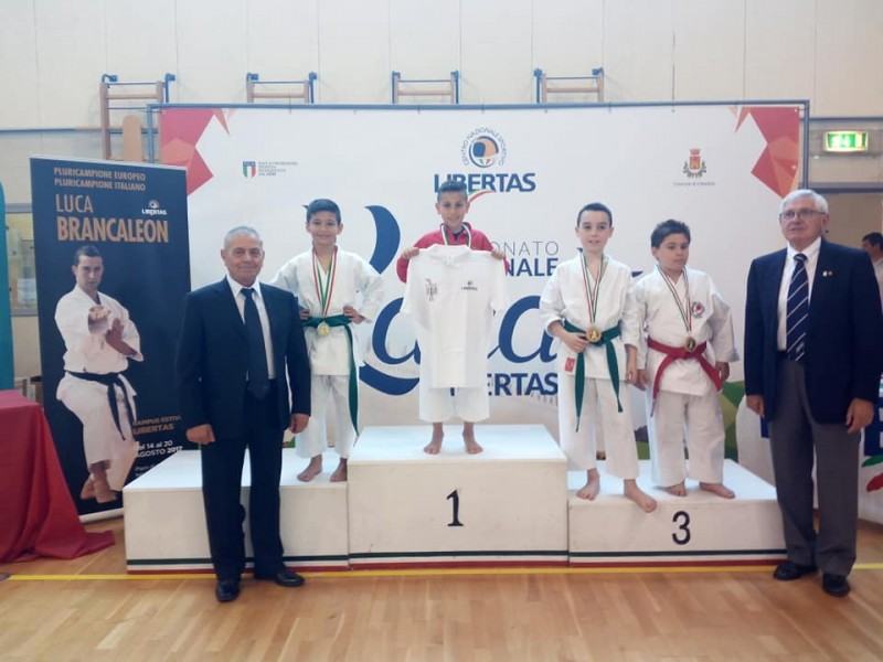 La squadra del Maestro Santi Trimboli ha ottenuto ottimi risultati distinguendosi per lo stile e la classe dei suoi atleti. Il primo titolo Italiano medaglia d’oro la conquista Carlo Emanuele nella categoria Ragazzi specialità Kata. Emanuele ha superato ben 4 incontri vincendo i suoi avversari sempre con un punteggio di 5 bandierine a 0. Elegante, determinato, sincronizzato e soprattutto pronto a vincere Emanuele ha ricevuto elogi da parte di tutti soprattutto da parte del TEAM Nazionale Libertas e dal Presidente. Figlio e nipote d’arte del Maestro Santi Trimboli non si è risparmiato e ha ottenuto nel pomeriggio una splendida medaglia d’argento , titolo di Vice Campione Italiano categoria ragazzi specialità Kumitè Kg -35. L’atleta ha saputo destreggiarsi e costruirsi i vari incontri che si sono susseguiti uno dopo l’altro. Determinato e soprattutto seguendo le indicazioni del suo Maestro Santi Trimboli è riuscito a vincere i vari incontri con tecniche vincenti, fermato in semifinale dal fortissimo atleta veneto, che per un solo punto è riuscito a battere l’atleta reggino che ha conquistato la Medaglia d’argento. Oro e quindi il titolo di Campione Italiano conquista l’atleta Margherita Trimboli Categoria Master specialità Kata. Margherita ha sbaragliato le sue avversarie molto competitive eseguendo i kata ( Forme) con ritmo, eleganza, forza e determinazione che hanno fatto la differenza conquistando l’oro nel KATA MASTER , titolo di Campionessa ITALIANA LIBERTAS . E’ riuscita a imporsi con i suoi Kata su tutte le migliori atlete in gara; eseguendo vari Kata per superare le fasi di qualificazione è stato un susseguirsi di incontri sempre più difficili e combattuti.
