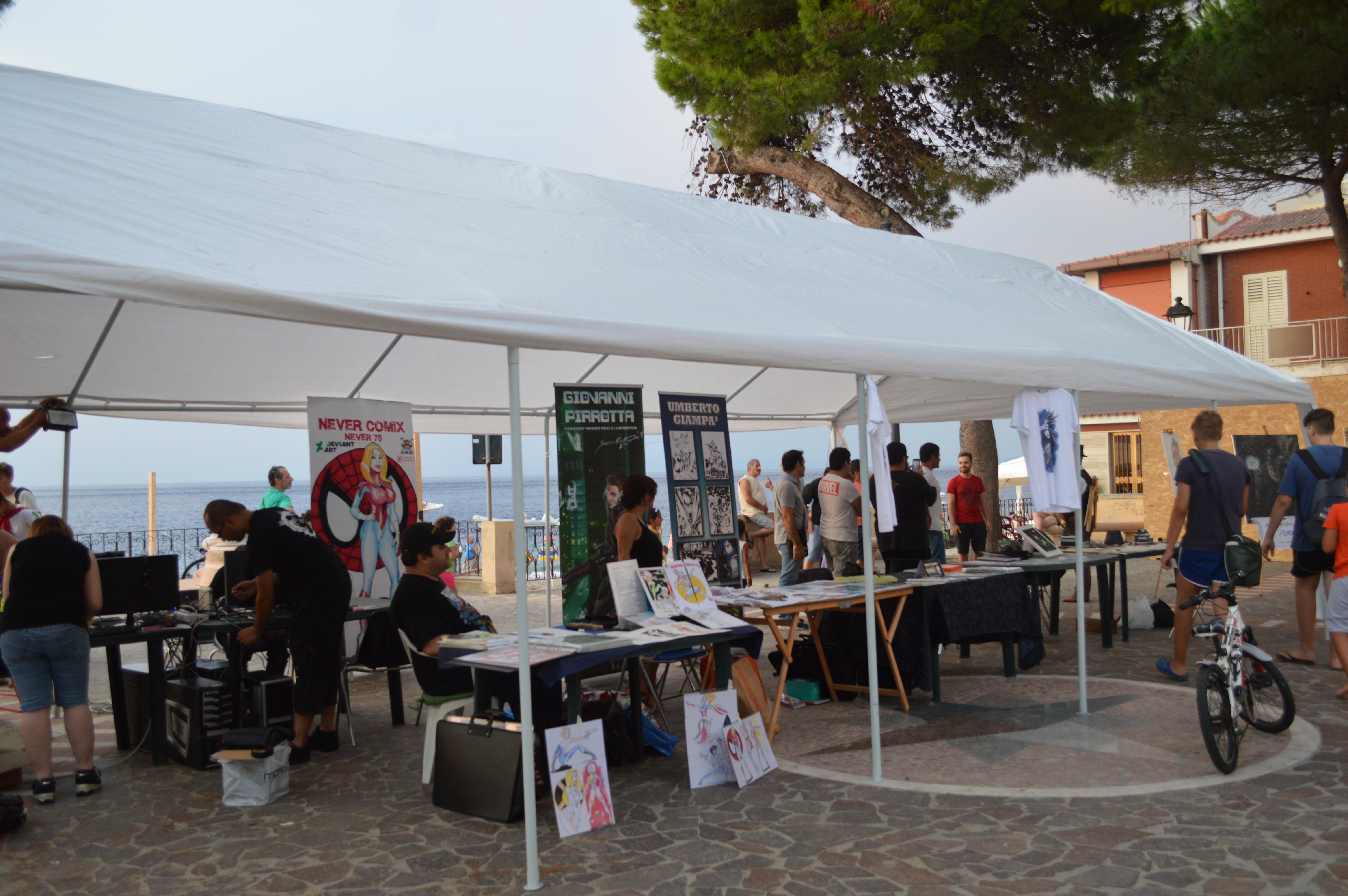Il manifesto del Komics, qualche stand e i ritratti del maestro Alessandro Allegra hanno colorato la piazzetta di Cannitello. Tra gli stand presenti, tanto fimo, qualche fumetteria, una postazione gioco allestita da Gamezone, qualche cosplayer e i ragazzi dell’associazione “Passami il Gladio”, che hanno inscenato un duello in stile medievale.