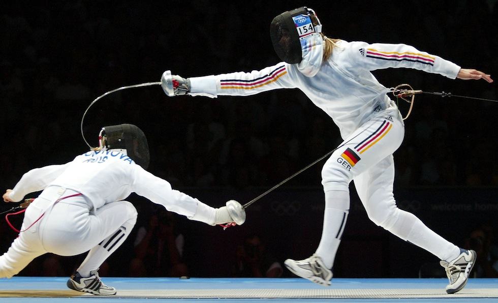 Germany's fencer Britta Heidemann, right, during the gold medal bout of the Women's Team Epee competition against Russian fencer Tatiana Logonova, left, at the Helliniko Fencing Hall in Athens during the 2004 Olympic Games, Friday, Aug. 20, 2004. (AP Photo/Michael Sohn)
