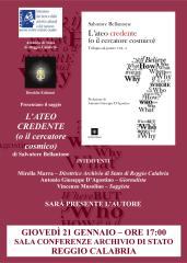 Si svolgerà oggi, alle ore 17:00, presso la sala conferenze dell’Archivio di Stato di Reggio Calabria, la presentazione del libro “L’ateo credente (o il cercatore cosmico). Trilogia sul potere VOL. 2” di Salvatore Bellantone (Disoblio Edizioni). Alla presentazione interverranno: Mirella Marra (Direttrice Archivio di Stato di Reggio Calabria), Antonio Giuseppe D’Agostino (Giornalista), Vincenzo Musolino (Saggista). Sarà presente l’Autore.