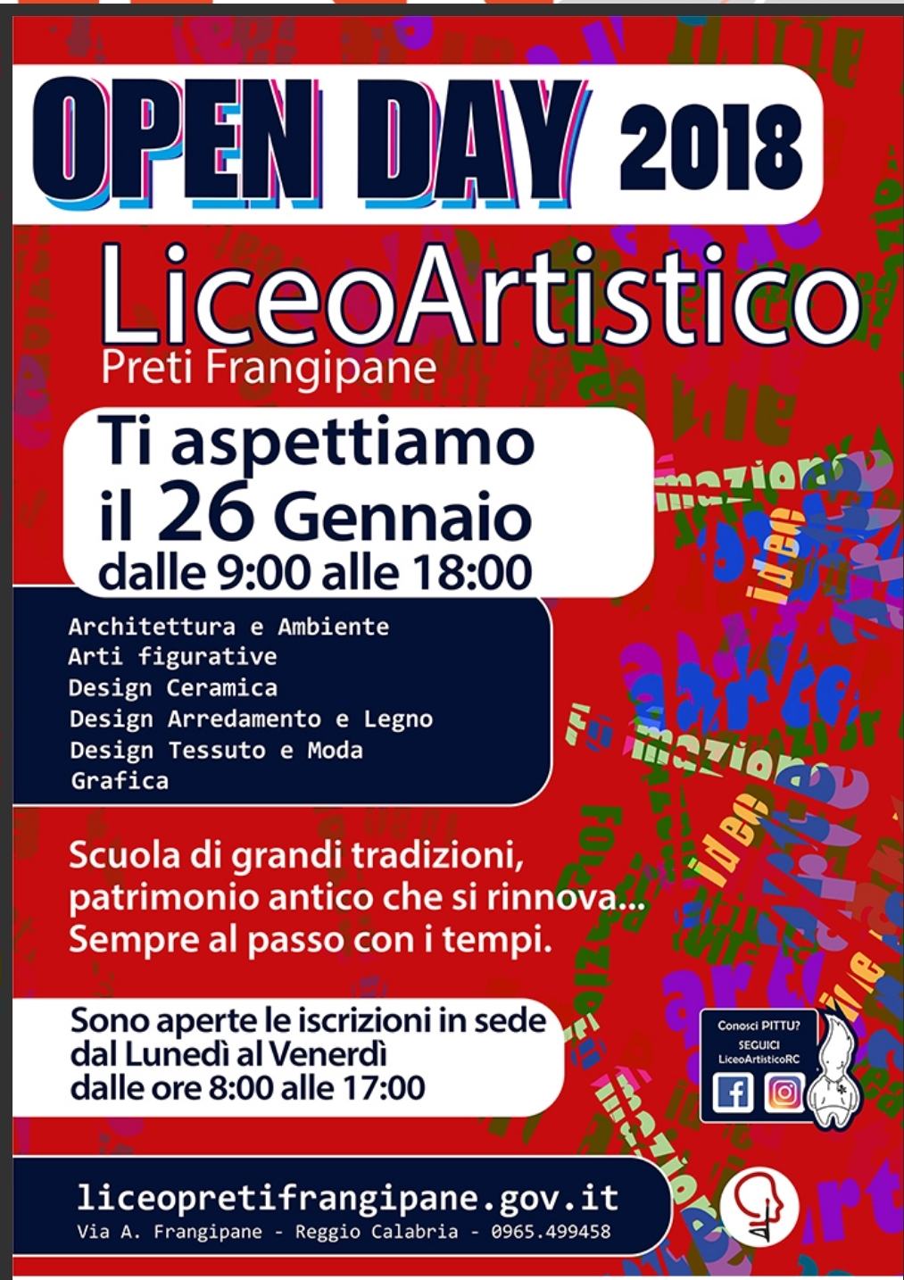 Oggi 26 Gennaio 2018 , il Liceo Artistico ” M.Preti –A .Frangipane”  di Reggio Calabria resterà aperto dalle ore 9,00 alle ore 18.00 per fornire, a genitori e allievi interessati  delle classi terze  delle scuole Secondarie di Primo Grado, la possibilità di conoscere  l’offerta formativa  del Liceo per l’anno scolastico 2018-2019,nei suoi molteplici e diversificati percorsi e indirizzi di studio. Con l’occasione  sarà  possibile   visitare i nuovi ambienti della scuola,  i numerosi e attrezzatissimi laboratori,  nonchè  la sala museale  in cui  sono custodite importanti e preziosissime  opere d’arte .