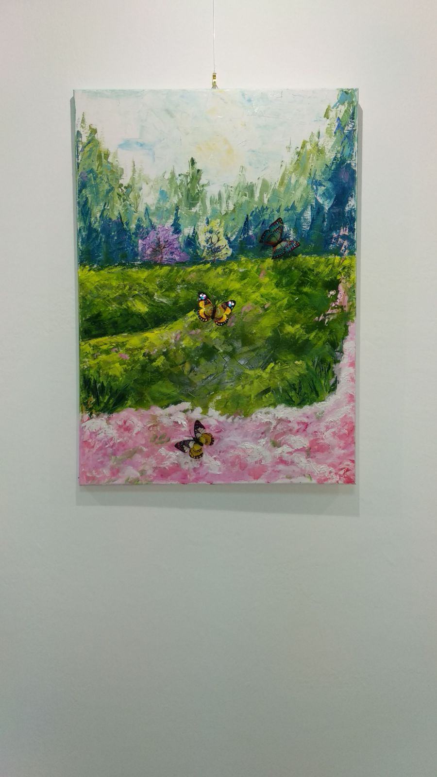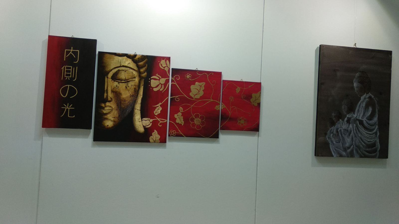 Per quanto riguarda i pannelli polimaterici centrali, questi ricordano il filone giapponese “ Kanga” con carattere manifestamente cinese e si caratterizzano per i colori tenui e limitati e una preferenza per le tonalità neutre e l’inchiostro nero, calibrate bene ,per esprimere non solo gli elementi del paesaggio, ma anche la luce e l’aria che li avvolgono.