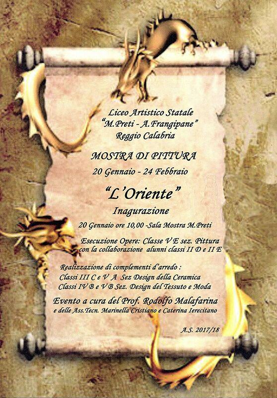 Oggi, sabato 20 Gennaio 2018 alle ore 10.00 presso la sala mostre del Liceo Artistico “M.Preti-A.Frangipane” di Reggio Calabria sarà inaugurata la mostra pittorica “L’Oriente” le cui opere sono state realizzate dagli allievi della classe 5E sez. Arti Figurative in collaborazione con le classi II E – II D dell’Istituto. La mostra, inoltre, è stata arricchita da complementi d’arredo progettati dagli alunni della sez, Design della Ceramica, classi III C e V A e dagli studenti di Design del Tessuto e della Moda, classi IV B e V B, che hanno ulteriormente impreziosito quest’ultima.