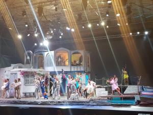 Di Anna Biasi – “Mamma mia!” che spettacolo! A ritmo delle canzoni degli svedesi Abba e musica interamente dal vivo con l’orchestra capitanata dal maestro Emanuele Friello posta in cima alla locanda “notti d’estate” di un’isola greca, Donna Sheridan, tostissima protagonista femminile (Sabrina Marciano la ballerina diplomata all’Accademia Nazionale di Danza di Roma) è la madre di Sofia (Eleonora Facchini dalla voce di usignolo) con la quale però non parla del passato e della paternità alla figlia. Quest’ultima fa di tutto per realizzare il suo desiderio più grande, quello di essere accompagnata all’altare da un papà che non ha mai conosciuto.