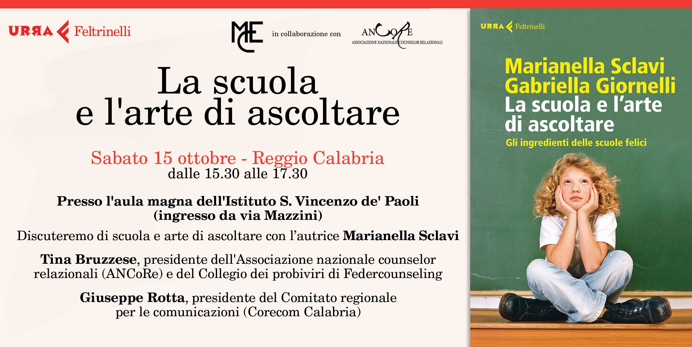 Con Marianella Sclavi siederanno al tavolo dei relatori Tina Bruzzese, presidente nazionale di A.N.Co.Re. e del Collegio dei probiviri di Federcounseling, e Giuseppe Rotta, presidente del Comitato regionale per le comunicazioni (Corecom Calabria).