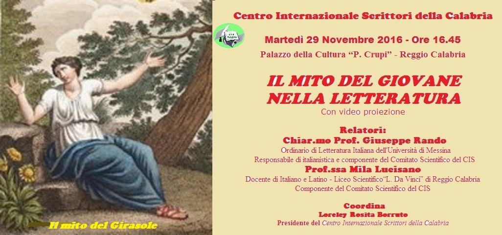 ”Il mito del giovane nella letteratura” è il titolo dell’incontro promosso dal Centro Internazionale Scrittori della Calabria che avrà luogo martedì 29 Novembre 2016, alle ore 16.45, nella Sala conferenze del Palazzo della Cultura “Pasquino Crupi” di Reggio Calabria.