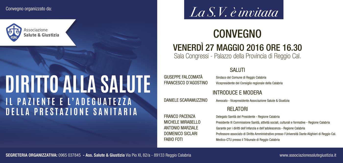 L’Associazione “Salute & Giustizia” ha infatti organizzato per venerdi 27 maggio 2016, alle ore 16:30, presso la Sala Congressi del Palazzo della Provincia di Reggio Calabria, il Convegno, aperto al pubblico, intitolato: “Diritto alla Salute.Il paziente e l’adeguatezza della prestazione sanitaria”, cogliendo così l’occasione di approfondire alcune tematiche di estremo rilievo sociale concernenti la tutela del diritto alla salute.