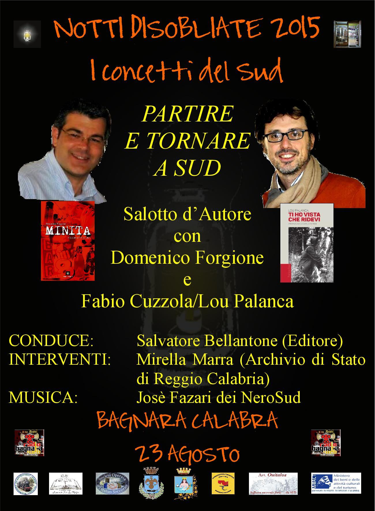 A parlare di “Partire e tornare a Sud” saranno Domenico Forgione, autore di “Minita” (Disoblio Edizioni) e Fabio Cuzzola / Lou Palanca 2 e Monica Sperabene / Lou Palanca 8, autori di “Ti ho vista che ridevi” (Rubbettino). Al salotto d’autore, condotto dall’editore Salvatore Bellantone, interverrà Mirella Marra (Direttrice “Archivio di Stato” di Regio Calabria). Gli intermezzi musicali saranno a cura del cantante Josè Fazari dei NeroSud.