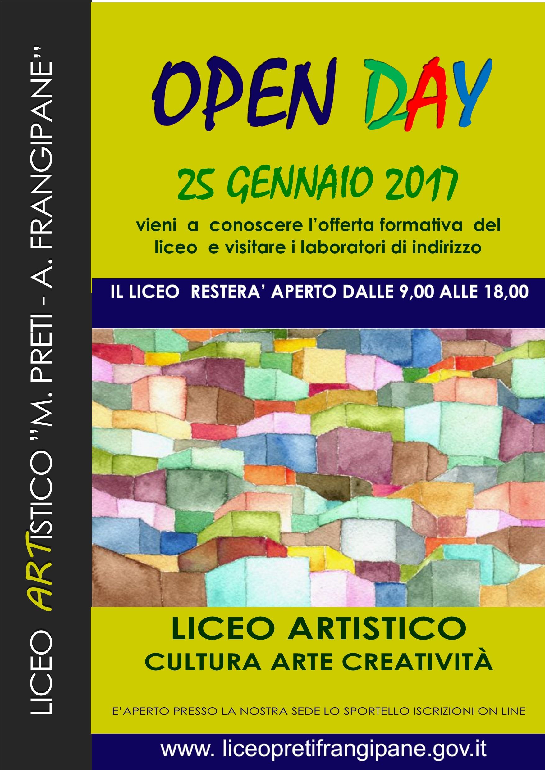 Mercoledi’ 25 gennaio, il Liceo Artistico “ M.Preti –A .Frangipane” di Reggio Calabria restera’ aperto dalla ore 9,00 alle ore 18,00 per fornire a genitori e allievi interessati delle classi terze delle scuole medie la possibilità di conoscere l’offerta formativa del Liceo per l’anno scolastico 2017-2018,nei suoi molteplici e diversificati percorsi e indirizzi di studio. Con l’occasione sarà possibile visitare i nuovi ambienti della scuola, i numerosi e attrezzatissimi laboratori, nonchè la sala museale in cui sono custodite importanti e preziosissime opere d’arte .
