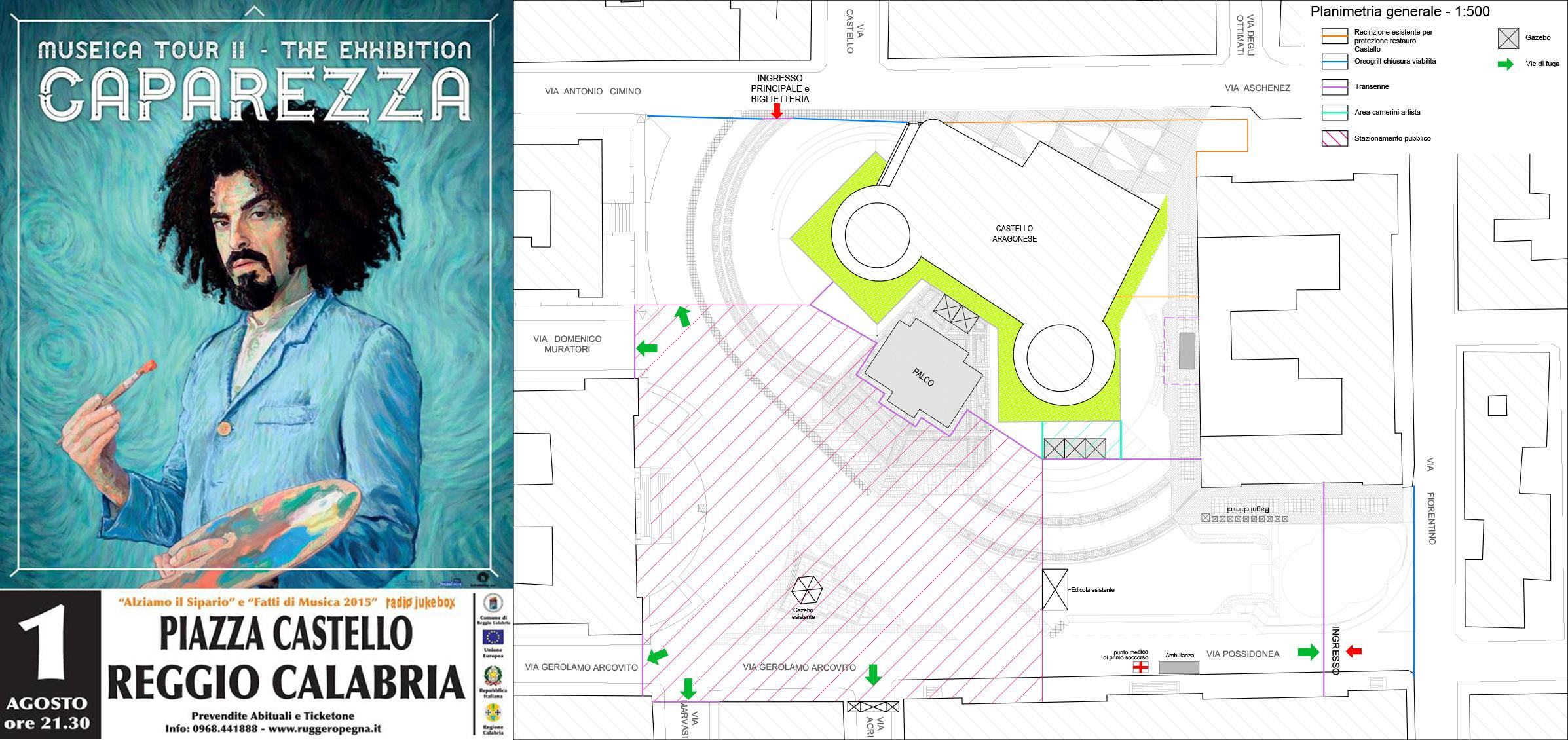 Iniziano domani pomeriggio nella suggestiva cornice della storica Piazza Castello di Reggio Calabria i lavori di allestimento dell’imponente palcoscenico che ospiterà sabato sera, 1 agosto, l’attesissimo concerto di Caparezza, unica tappa calabrese del tour “Museica II The Exhibition”, ennesimo appuntamento di “Fatti di Musica 2015”, la ventinovesima edizione della Rassegna-Festival del Miglior Live d’Autore che si svolge ogni anno in Calabria, diretta e organizzata da Ruggero Pegna. Il palcoscenico interamente coperto, con un frontale di oltre venti metri, sarà sistemato davanti al Castello. Nell’intera area saranno predisposte le barriere necessarie per la chiusura delle vie di accesso, che diventerà operativa a partire dalle ore 13 di sabato. Il pubblico munito di biglietto potrà accedere all’interno della piazza per assistere al concerto da via Antonio Cimino, a partire dalle ore 19.30. La biglietteria sarà sistemata in prossimità del varco di entrata. I biglietti sono regolarmente in vendita, al prezzo di euro 20.50, in tutti i punti vendita e Ticketone (elenco completo al sito www.ruggeropegna.it oppure alla segreteria organizzativa tel. 0968441888).