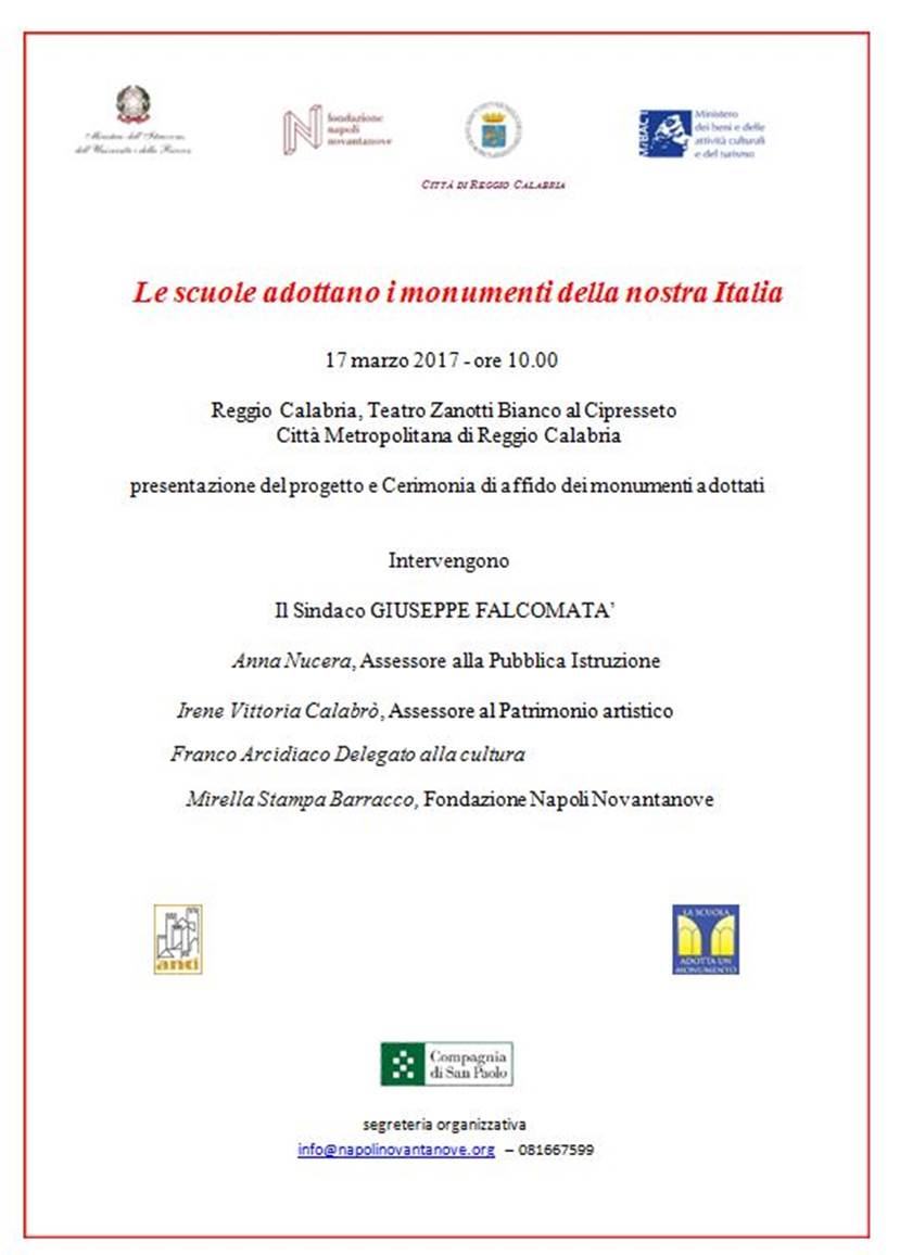 Il prossimo 17 marzo alle ore 10 presso il teatro Zanotti Bianco al Cipresseto avverrà la presentazione del progetto e cerimonia di affido dei monumenti adottati nell’ambito della iniziativa nazionale “ Le scuole adottano i monumenti della nostra Italia”.