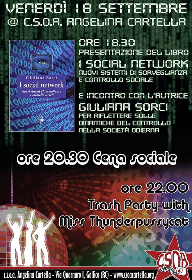 L’avvento dei Social network insieme alla diffusione di tecnologie informatiche e di telecomunicazioni sempre più evolute, ha condizionato notevolmente la nostra società, con delle inevitabili conseguenze di cui purtroppo ancora non abbiamo piena consapevolezza. Nonostante le grandi e diverse potenzialità e possibilità di impiego, l’influenza di questi potentissimi sistemi di comunicazione ha prodotto anche “nuovi sistemi di sorveglianza e di controllo sociale”, come appunto sottolineato nell’inquietante sottotitolo del volume “I social network” di Giuliana Sorci che sarà presentato dalla stessa autrice venerdì 18 settembre al c.s.o.a. “A. Cartella” a partire dalle ore 18.30.