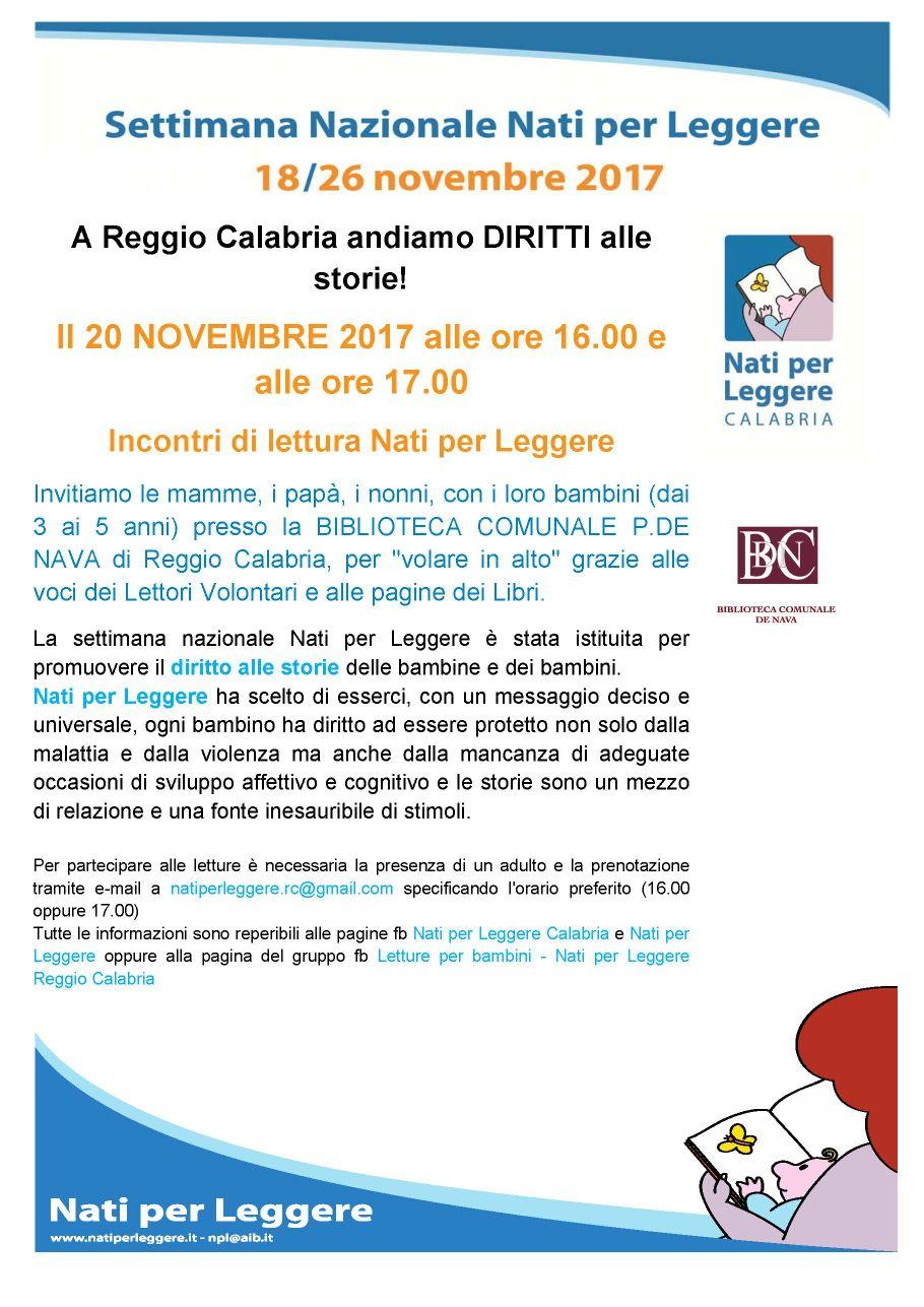 A Reggio Calabria, proprio il 20 novembre, presso la Biblioteca Comunale P. Da Nava alle ore 16.00 e alle ore 17.00 si svolgeranno due incontri di letture per bambini dai 3 ai 5 anni. Per partecipare alle letture è necessaria la presenza di un adulto (la mamma, il papà, il nonno…) e la prenotazione tramite e-mail all’indirizzo natiperleggere.rc@gmail.com specificando l’orario preferito (16.00 oppure 17.00).