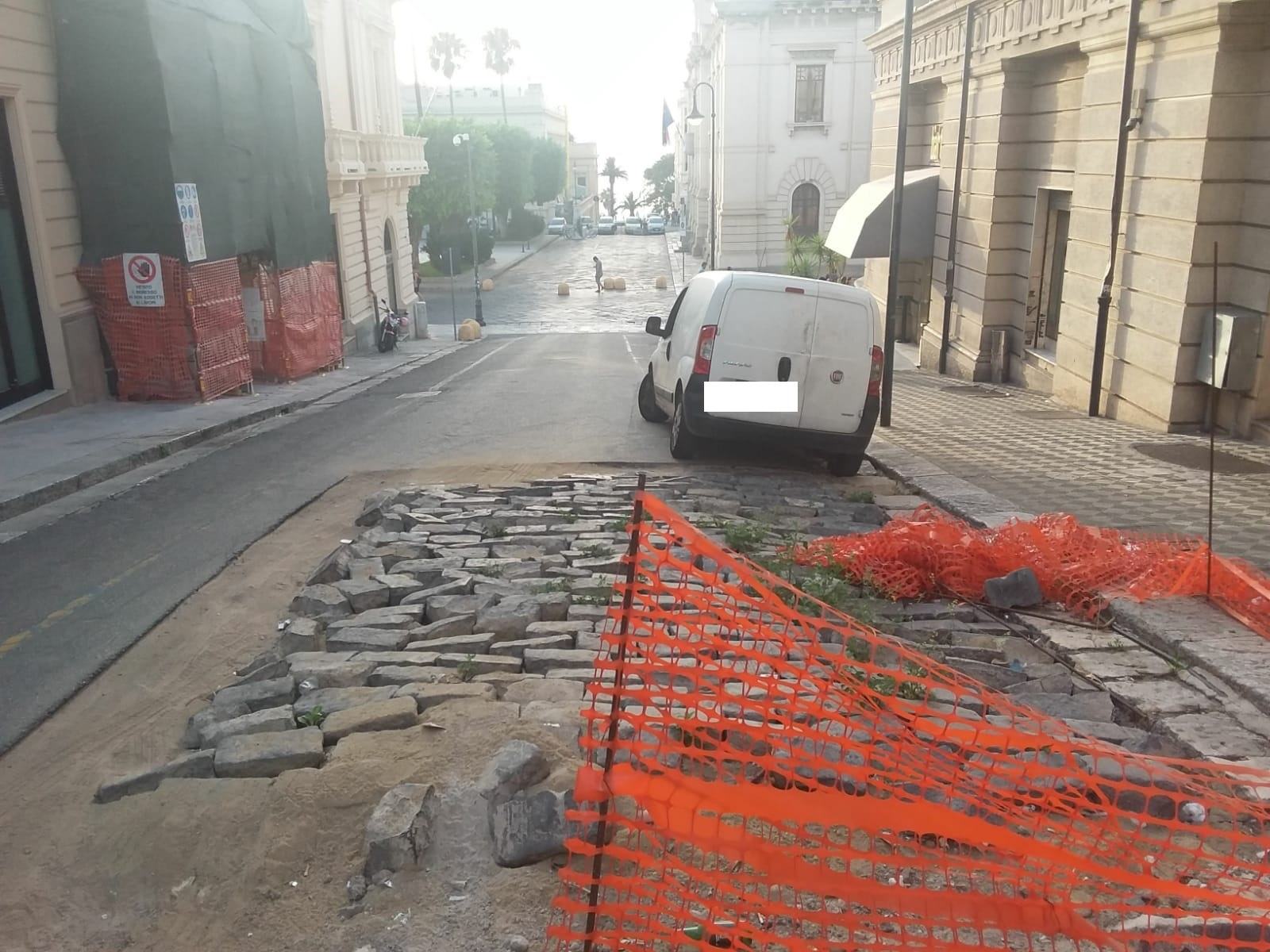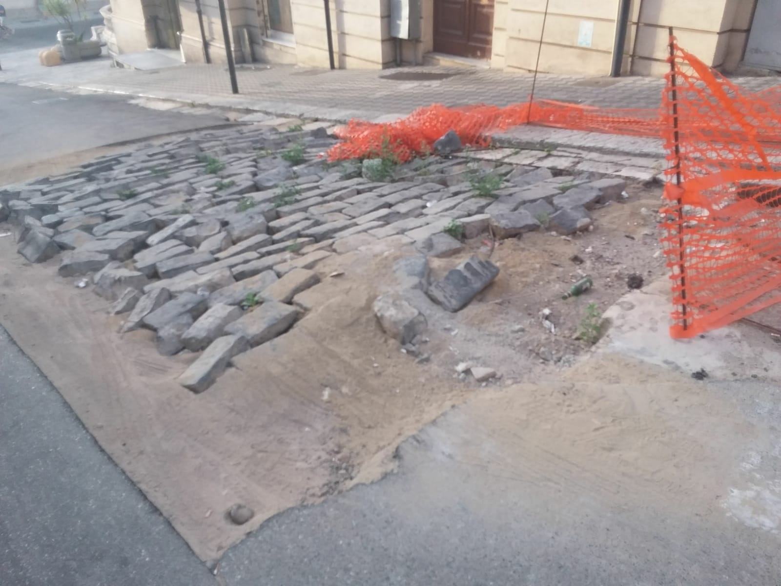 Perchè i lavori al manto stradale non vengono conclusi? Tutto nasce da un intervento alla rete fognaria realizzato da Idroreghion nei mesi scorsi, lavoro che aveva richiesto di scoprire il basolato sottostante.