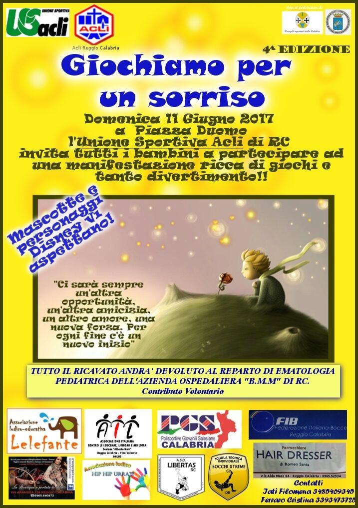 Anche quest’anno l’US ACLI e le ACLI di Reggio Calabria, insieme all’LELEFANTE, le PGS, la FIB, l’ASD LlBERTAS, la HIP HIP URRA’, l’AIL e la scuola di tecnica individuale SOCCER XTREME, sono promotrici della manifestazione “GIOCHIAMO PER UN SORRISO”. L’evento, giunto ormai alla IV edizione, si terrà a Piazza Duomo il prossimo 11 giugno, dalle 10 alle 13 e dalle 16 alle 20. Anche quest’anno, dunque, gli organizzatori promuoveranno diversi sport quali calcio, pallavolo e bocce e laboratori creativi per tutti i bambini che vorranno trascorre qualche ora in allegria.