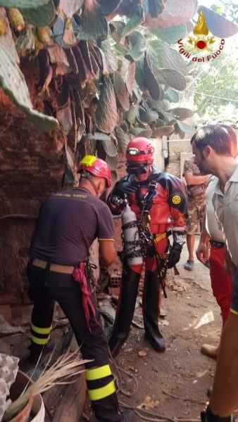 I Vigili del Fuoco attuando una manovra SAF (Speleo Alpino Fluviale) hanno calato un sommozzatore all’interno del pozzo per una profondità di 30 metri.