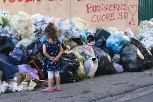 Una bimba di soli tre anni davanti ad un cumulo di sacchetti di immondizia. Testa bassa e sguardo fisso sulla montagna maleodorante che le si presenta di fronte.
