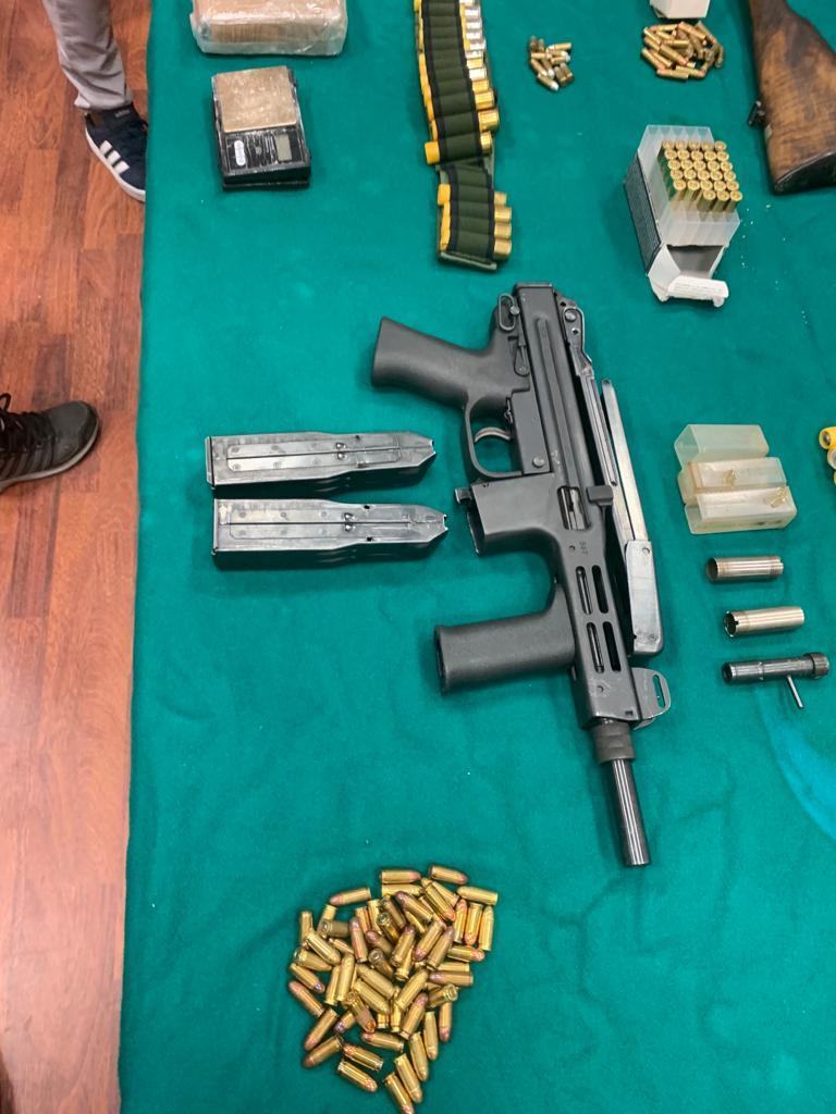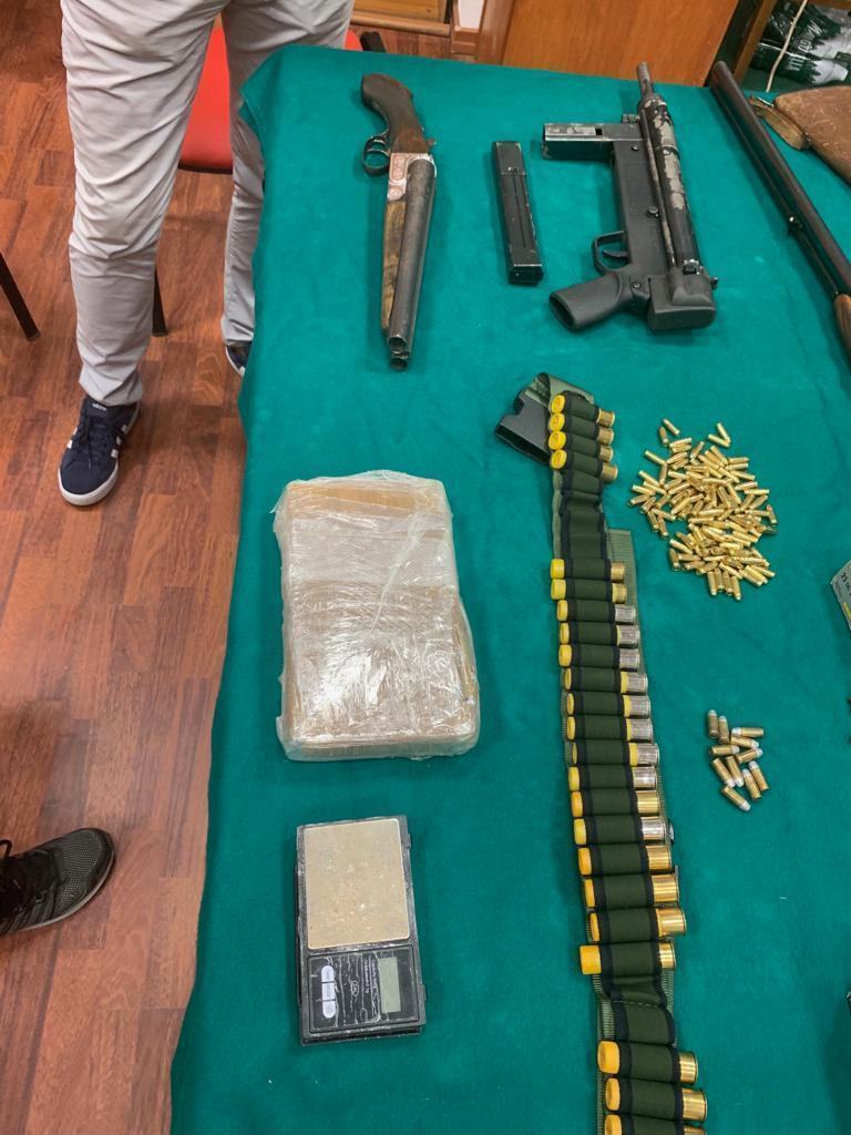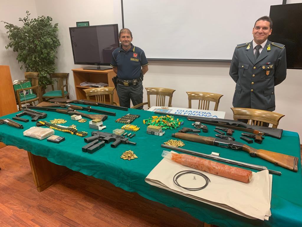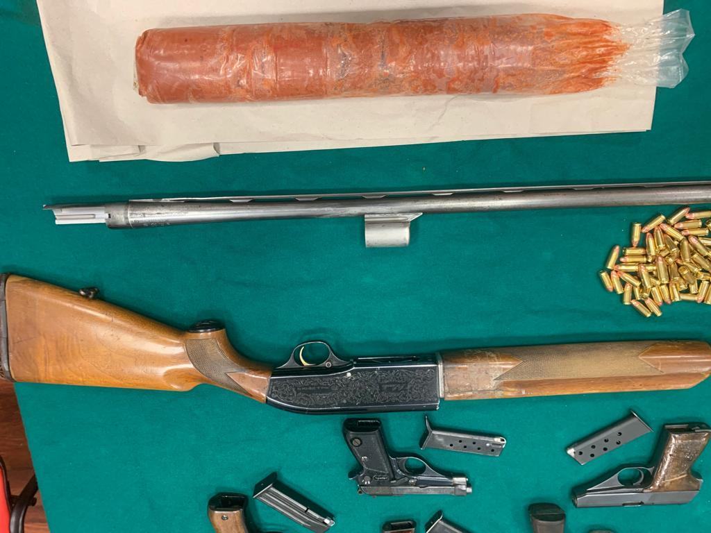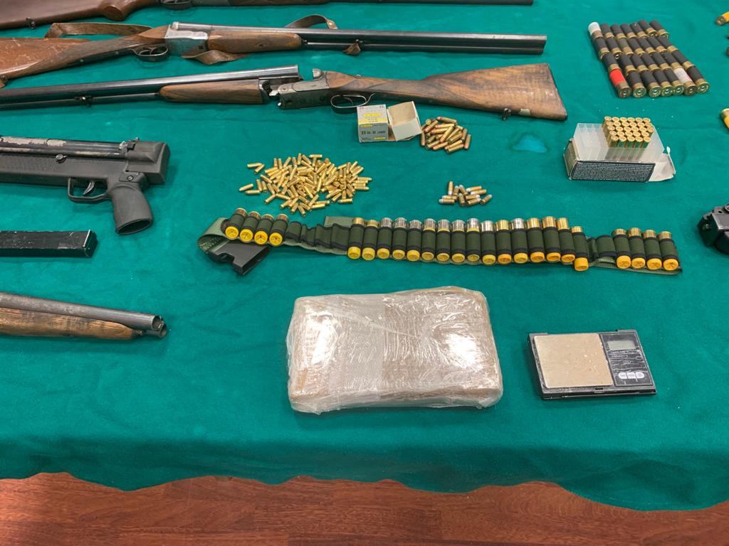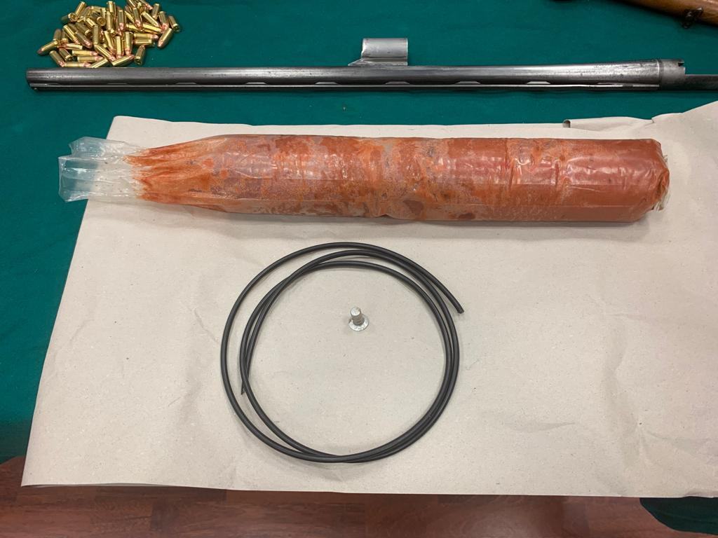 Sul pianale di legno, che costituiva un soppalco artigianale, venivano infatti ritrovati, nel complesso, oltre 2 chili e mezzo di esplosivo (gelatina-dinamite, con relativa miccia e con relativo detonatore), un panetto da 1.100 grammi di cocaina riportante impresso uno dei classici simboli della massoneria (incentrato su un gioco a incastro di figure rappresentanti una squadretta, un occhio ed un compasso), nr. 2 pistole mitragliatrici, nr. 6 fucili da caccia, nr. 1 fucile a canne mozze, nr. 4 pistole semiautomatiche, nr. 1 pistola a tamburo, nr. 2 strozzatori per fucile da caccia e oltre 500 cartucce di varia tipologia.