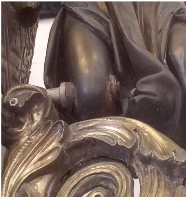 Dal punto di vista conservativo la Vara, pregevole opera di argenteria messinese, presenta lacune delle lamine metalliche ed è in un pessimo stato di conservazione, dovuto principalmente alla natura dei materiali che lo costituiscono, particolarmente sensibili alle condizioni microclimatiche, aggravate dall’azione di agenti aggressivi e da manutenzioni che hanno contribuito, attraverso puliture con prodotti non idonei, a innescare processi di corrosione. Inoltre, tutte le superfici in argento e rame dorato ed in ottone sono coperte da polveri grasse, depositi superficiali, nonché gocce di cera di candele, sostanze in parte inglobate e rese compatte da protettivi superficiali applicati durante precedenti interventi manutentivi. La lucentezza delle lamine in argento è offuscata da un pesante strato di solfuro d’argento. Non sono pertanto più apprezzabili le lavorazioni superficiali realizzati dagli argentieri, con il sapiente uso di martellinature e cesellature, che trattarono le superfici, lucide e brillanti, satinate e vibranti, leggermente opache, accanto a zone in ombra lasciate quasi grezze. L’apparato decorativo inoltre, a causa delle vibrazioni e sollecitazioni causate dalle cadenzate processioni alla quale la Vara è sottoposta, presenta numerose lesioni delle lamine.