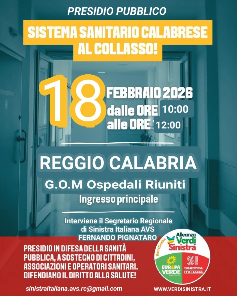 La mobilitazione di AVS toccherà Reggio Calabria mercoledì 18 Febbraio dalle ore 10 presso l’entrata principale degli ospedali Riuniti di Reggio Calabria, dove si distribuiranno volantini con le proposte e le richieste di Alleanza verdi e Sinistra e si rilasceranno dichiarazioni in merito.