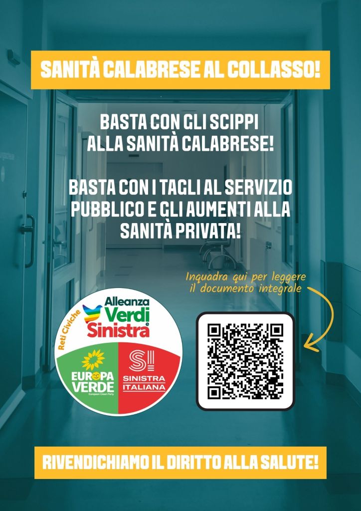 In virtù della grave situazione che investe la sanità calabrese, AVS (Alleanza Verdi e Sinistra) ha deciso di mettere in campo una serie di iniziative presso le sedi dei principali ospedali Calabresi per sollecitare il Governo nezionale e regionale a prendere urgenti provvedimenti in merito.