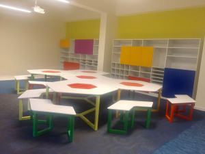 In particolare, l’aspetto cromatico esistente, caratterizzato da predominanti toni caldi, è stato bilanciato mediante l’introduzione di toni freddi e arricchito da soluzioni illuminotecniche, con caratteristiche di sostenibilità energetica, che permettono una migliore ed equilibrata distribuzione luminosa negli spazi. Il risultato è un ambiente più accogliente, in relazione dinamica con il resto della struttura scolastica.