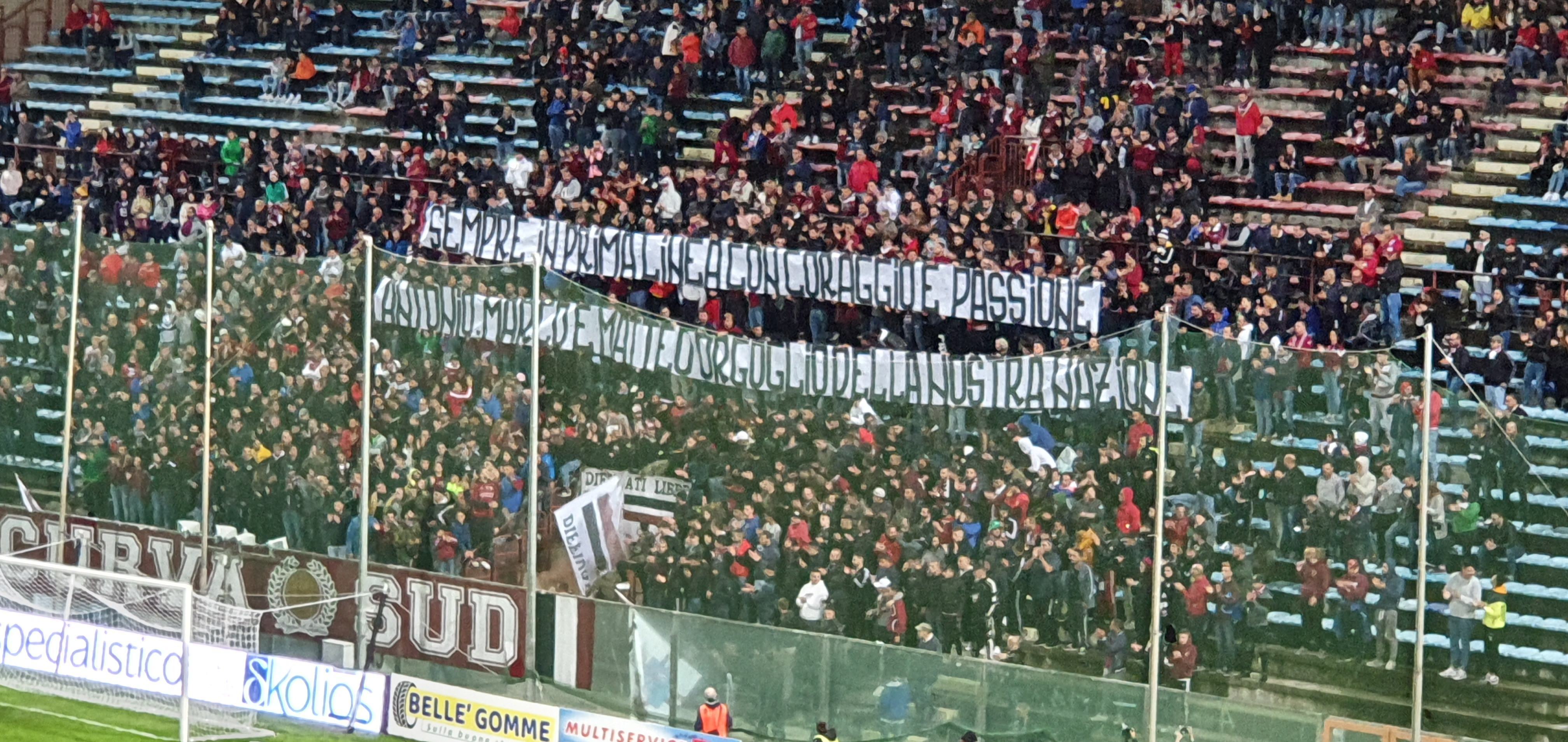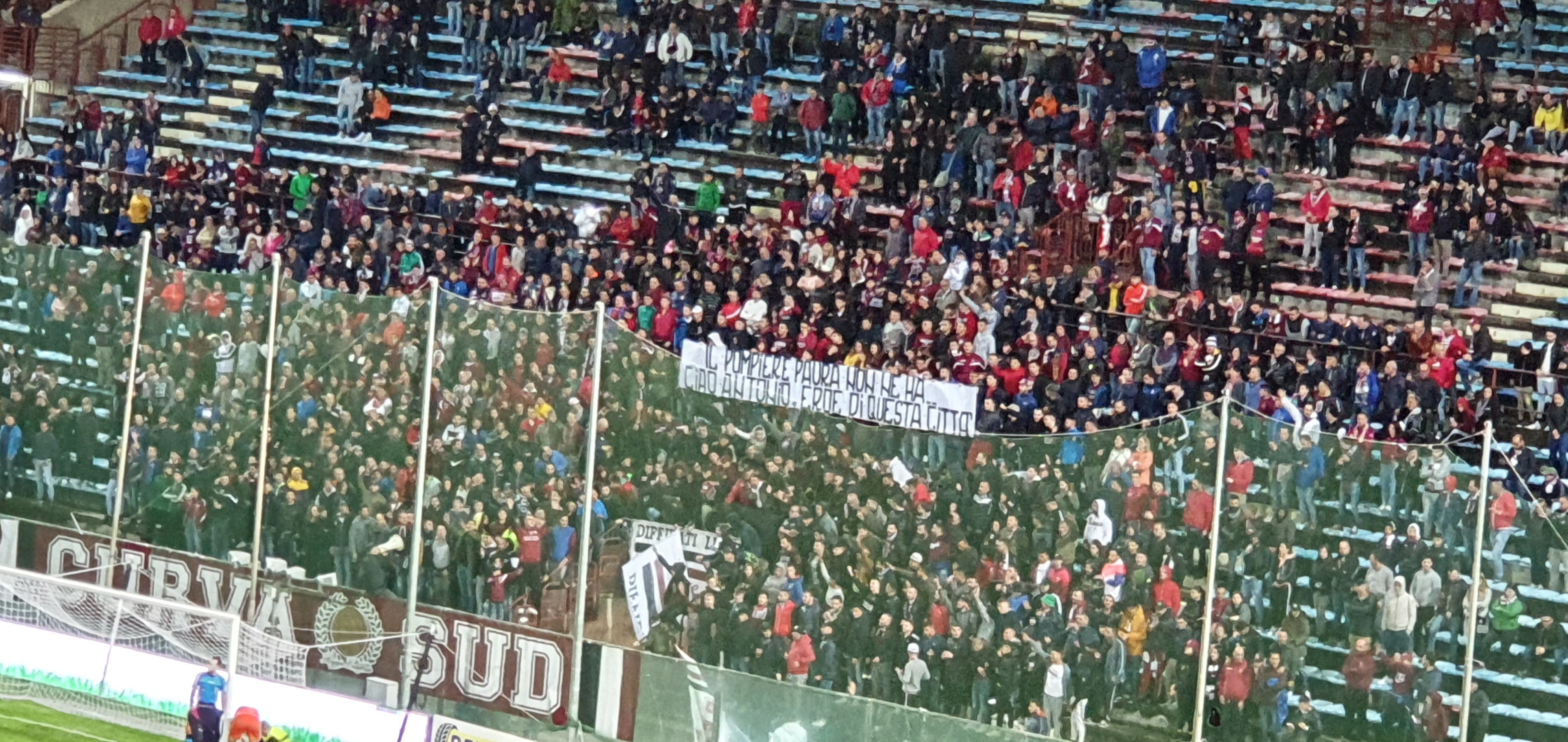 Con il sottofondo del coro “Il Pompiere paura non ne ha“, la Curva Sud, in occasione della gara di Coppa Italia tra Reggina e Potenza, ha ricordato Antonino Candido, il Vigile del Fuoco che ha perso la vita nella tragedia di Alessandria, con uno striscione:
