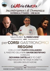 - Chiuderemo il weekend domenica 17 marzo dalle ore 18,00 con i “perCorsi Gastronomici Reggini“, cooking-show a cura dello Chef Filippo Cogliandro, del maestro Gelatiere Davide Destefano e con la sapiente regia di Giovanna Cartellà, titolare di “Io Chef”, naturalmente, durante la preparazione delle pietanze, il pubblico parteciperà alla degustazione. I soci ed i cittadini sono invitati.