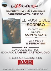 - Sabato 16 marzo alle 18.30 lo scrittore Carmine Abate sarà ospite con il suo ultimo capolavoro letterario “Le Rughe del Sorriso “, papabile premio Strega 2019. La serata sarà presentata e condotta dal Dott. Edoardo Lamberti Castronuovo.